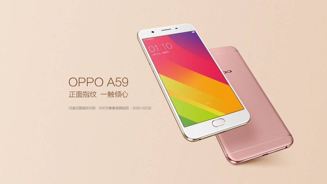 Oppo A59 vừa chính thức được giới thiệu tại Trung Quốc với giá bán sau khi quy đổi vào khoảng 274 USD. A59 có màn hình IPS 5,5″ độ phân giải 720p, chip xử lý MediaTek tám nhân 1.5 GH, 3 GB RAM, bộ nhớ trong 32 GB và cảm biến vân tay trong nút Home. Vỏ máy bằng nhôm nguyên khối và chỉ có hai màu Gold / Rose Gold